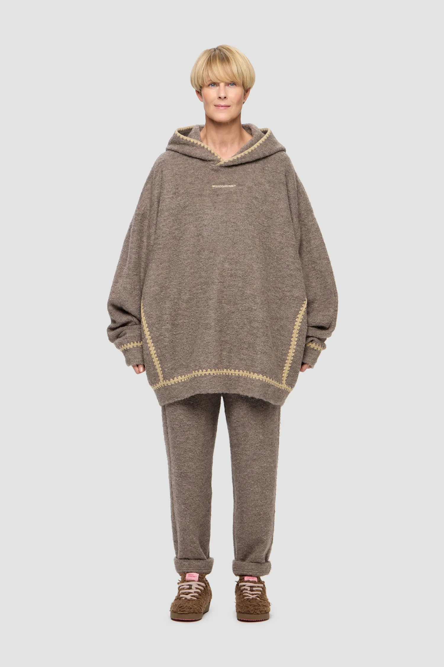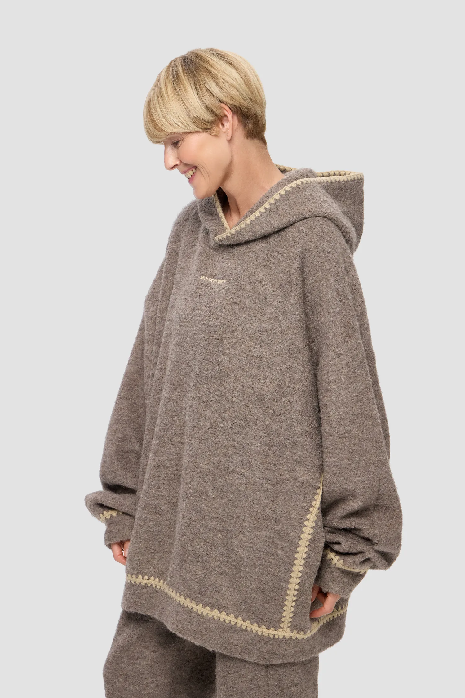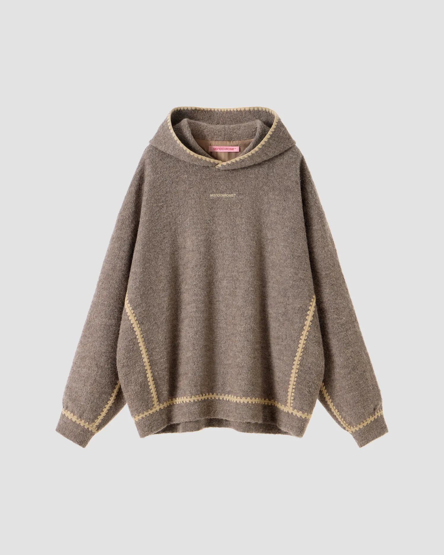 Худи свободного кроя с глубоким капюшоном из коллекции VILLAGE'25. Фактурный трикотаж выполнен из смесовой шерсти альпаки. Натуральный подклад с вискозой в составе позволяет телу «дышать». Детали изделия соединены специальной машинной вышивкой с имитацией ручной обвязки. Рельефный логотип MONOCHROME на груди. Упаковка в подарочную коробку.