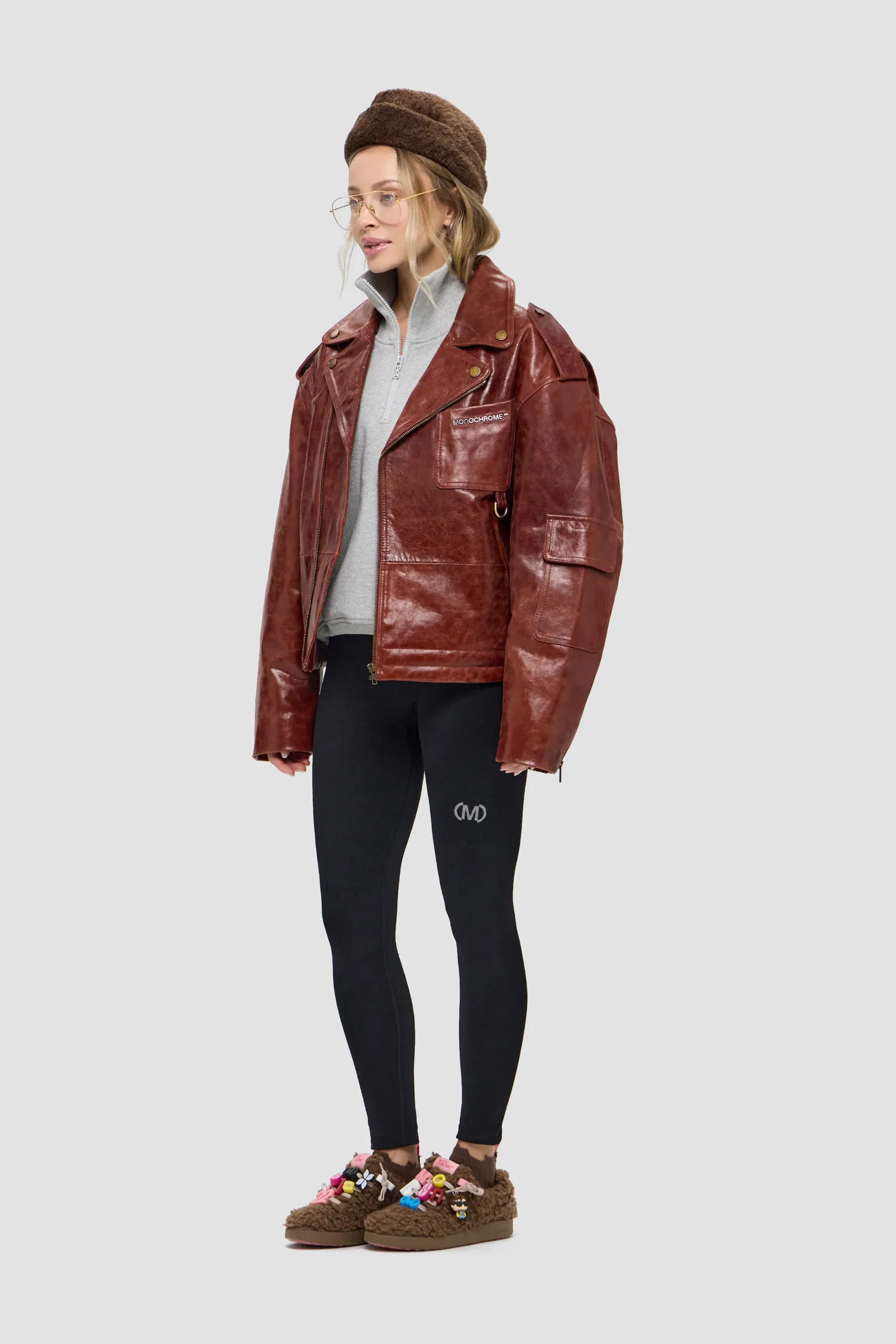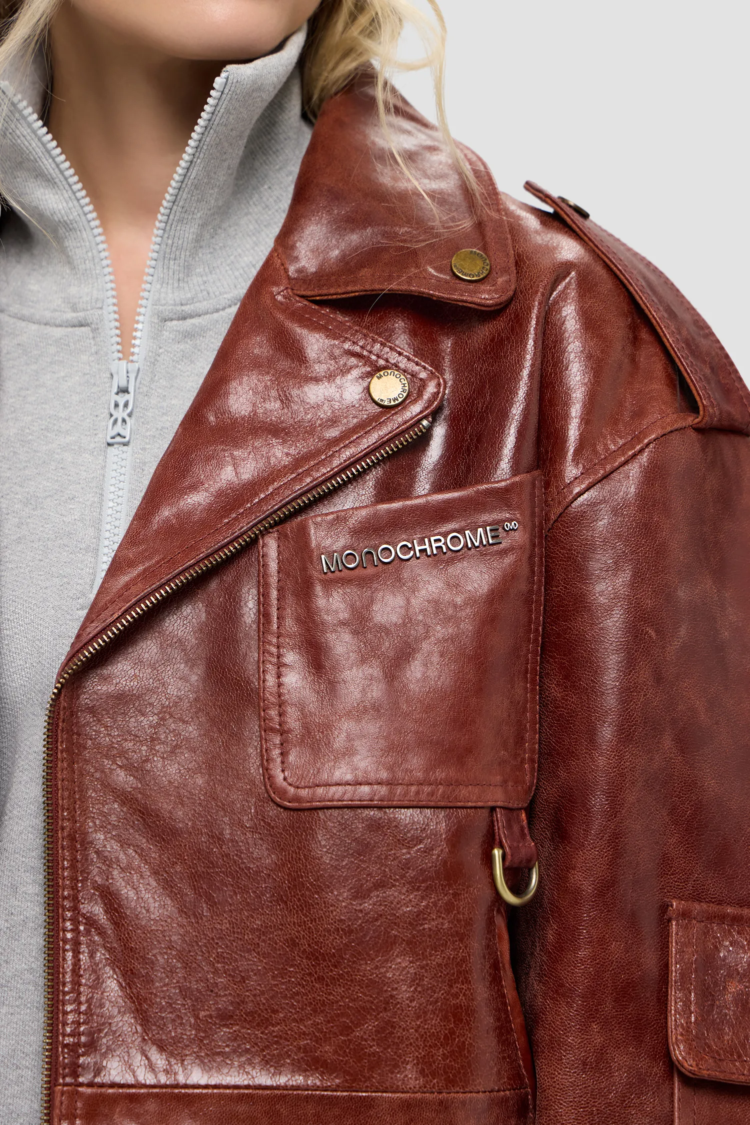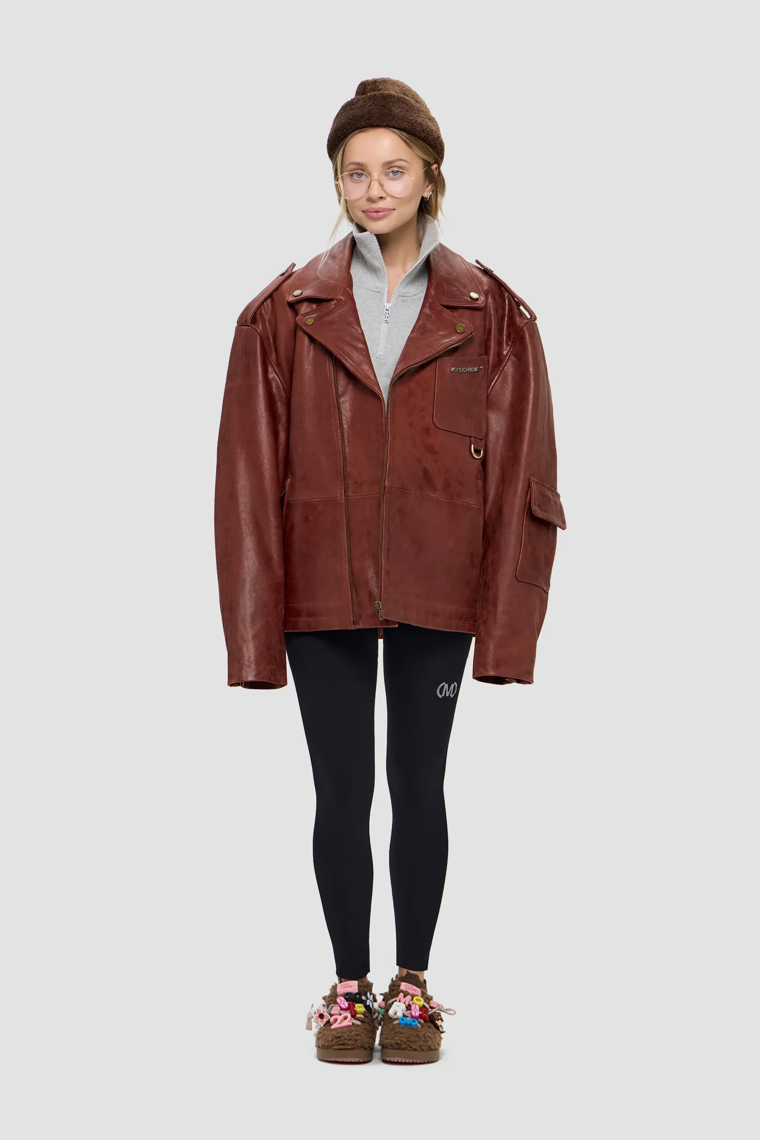Косуха оверсайз из плотной фактурной кожи. 100% натуральная кожа. Смещенная застежка на молнии спереди, рукава на молнии. Металлическая фурнитура, пуговицы с логотипом. Металлический логотип MONOCHROME на кармане в цвете "gunmetal grey". Отложной воротник и лацканы на кнопках. Коричневый подклад из 100% вискозы. Два боковых кармана на молнии, нагрудный карман, накладной карман с декоративным клапаном на рукаве, внутренние карманы на кнопке. Изделие поставляется в фирменном кофре на деревянных плечиках.