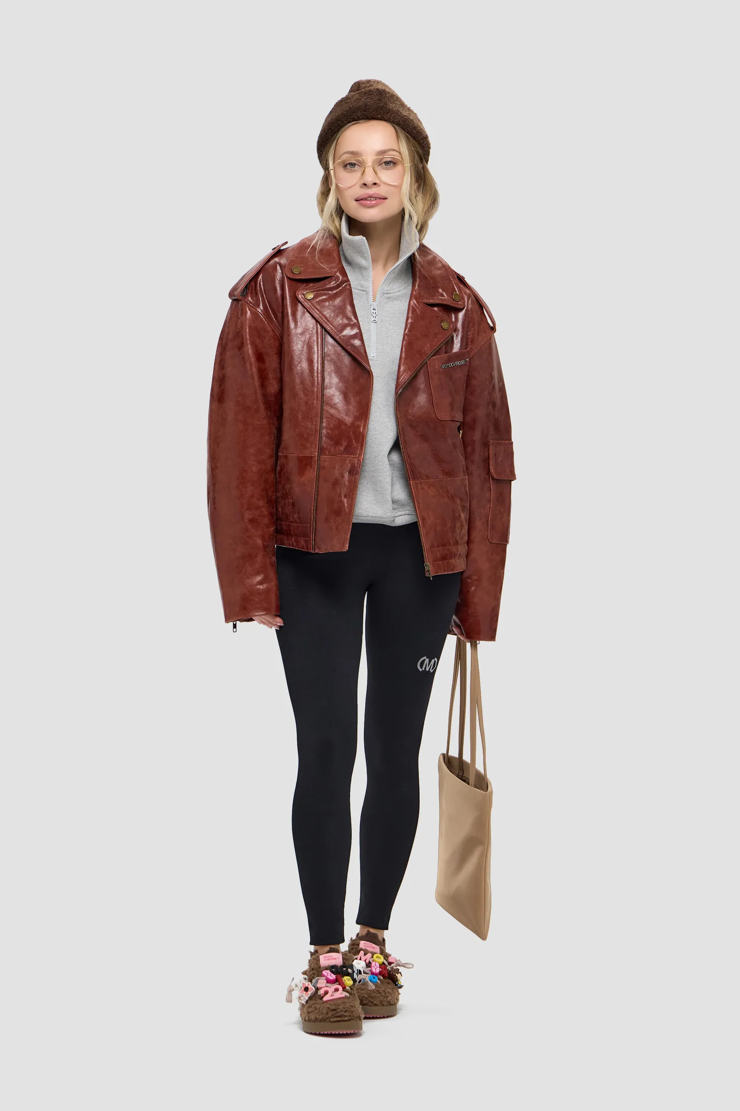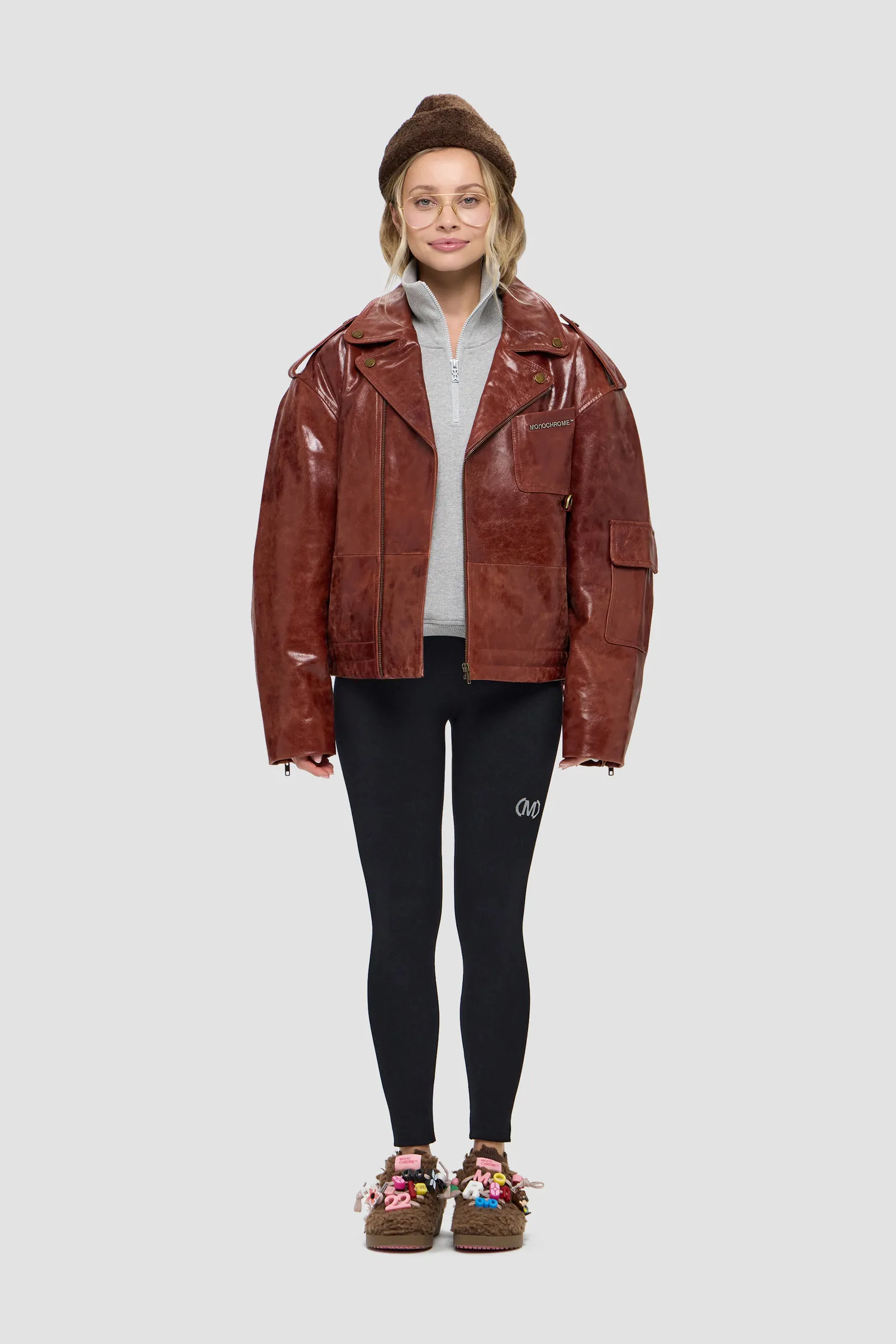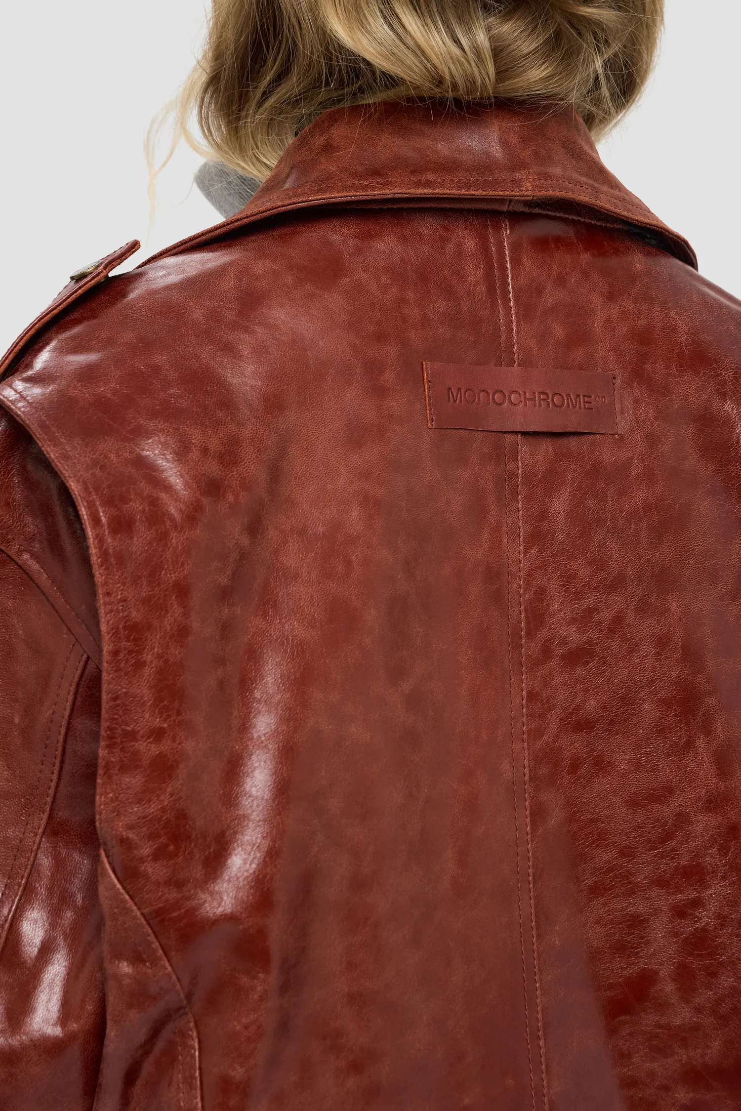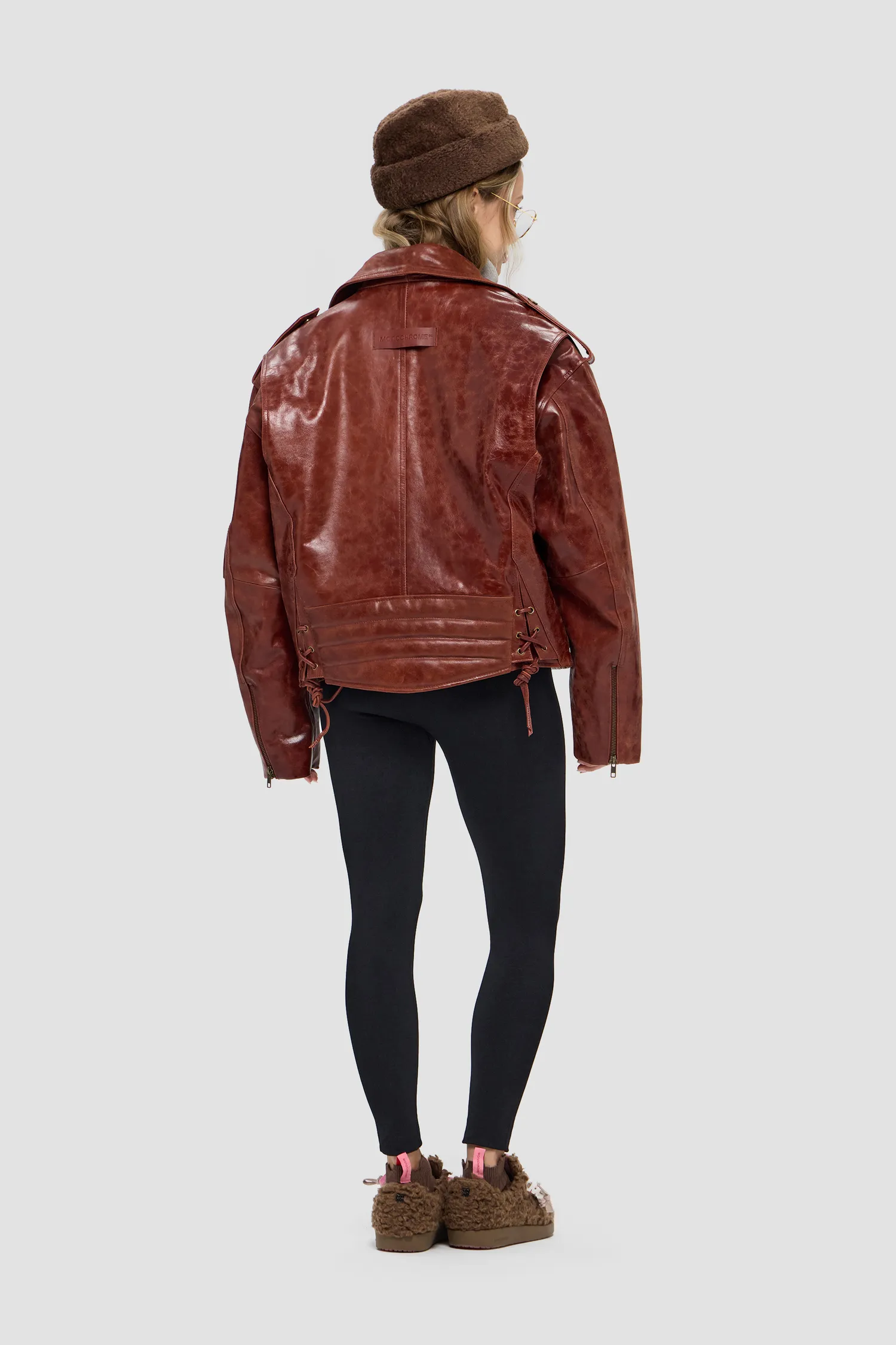Косуха оверсайз из плотной фактурной кожи. 100% натуральная кожа. Смещенная застежка на молнии спереди, рукава на молнии. Металлическая фурнитура, пуговицы с логотипом. Металлический логотип MONOCHROME на кармане в цвете "gunmetal grey". Отложной воротник и лацканы на кнопках. Коричневый подклад из 100% вискозы. Два боковых кармана на молнии, нагрудный карман, накладной карман с декоративным клапаном на рукаве, внутренние карманы на кнопке. Изделие поставляется в фирменном кофре на деревянных плечиках.