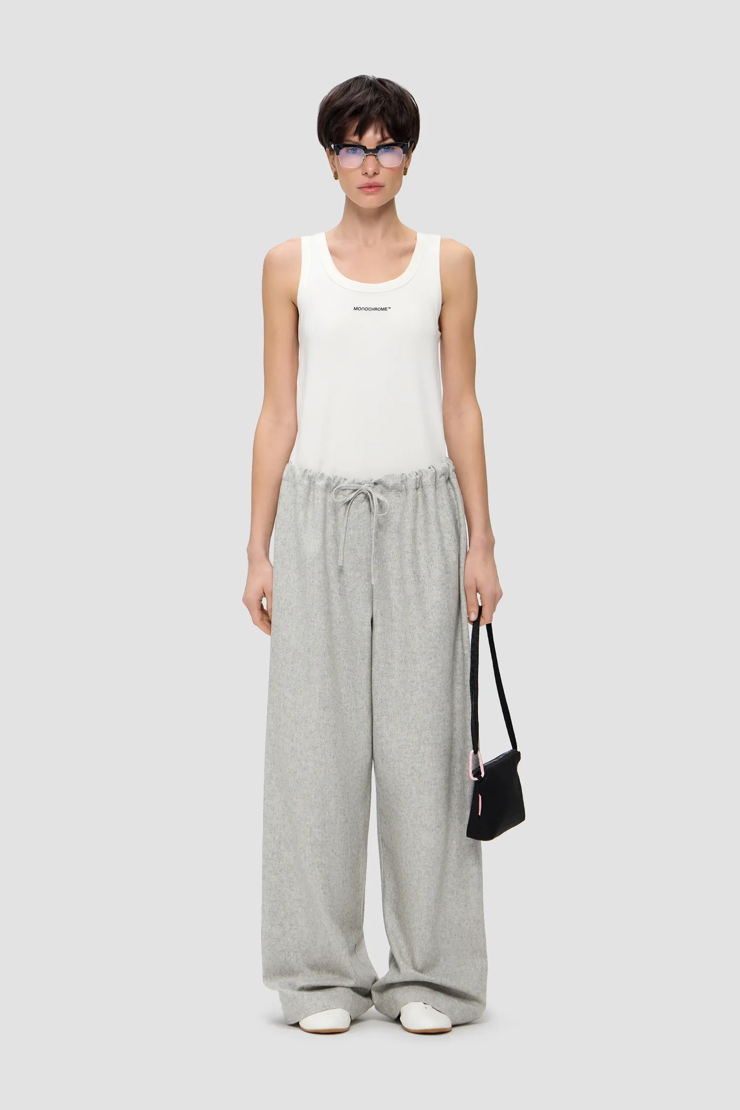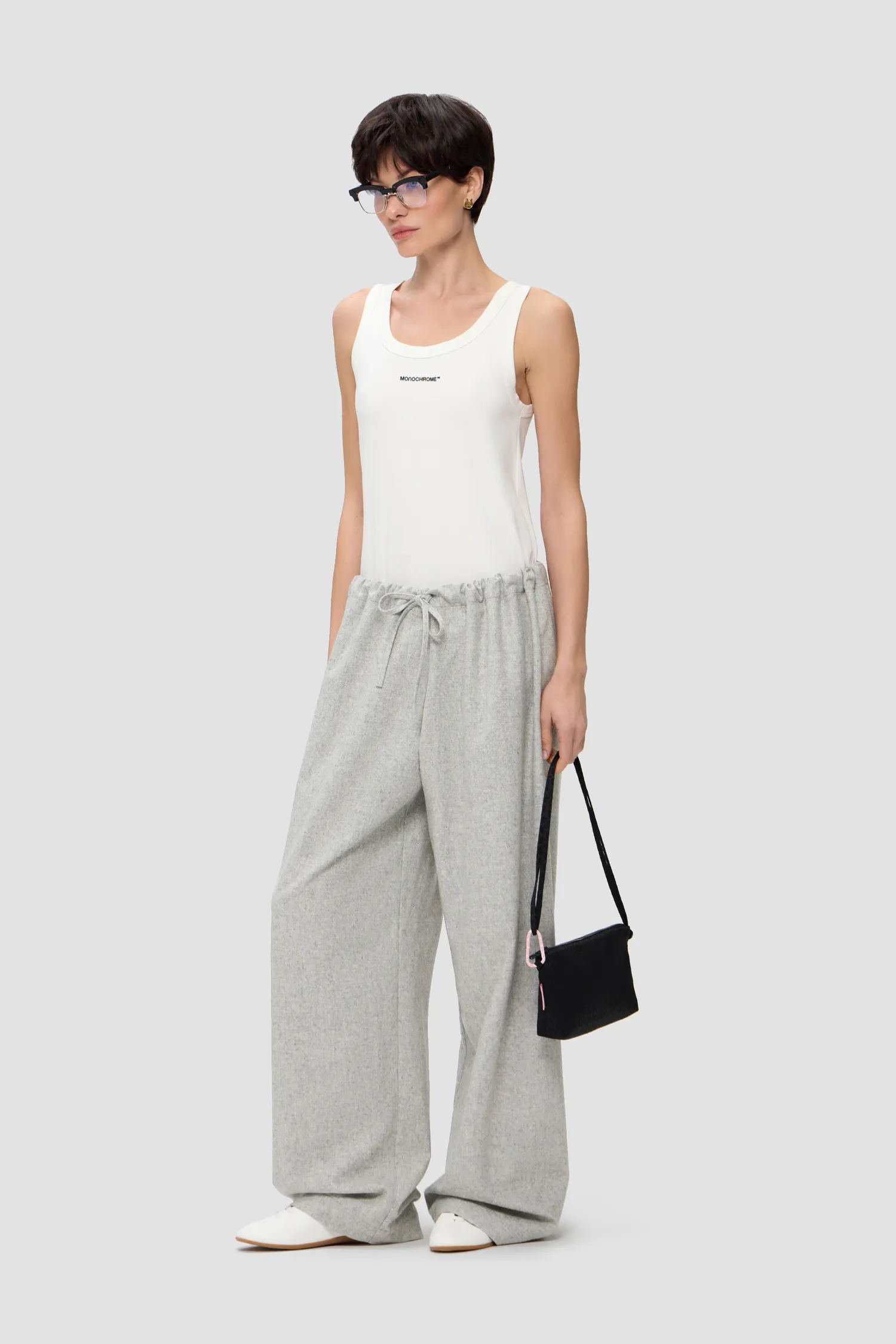 Прямые брюки из смесовой шерсти серого цвета. Пояс на резинке с завязками. Упаковка в подарочную коробку. Сделано в России на собственной мануфактуре MONOCHROME.