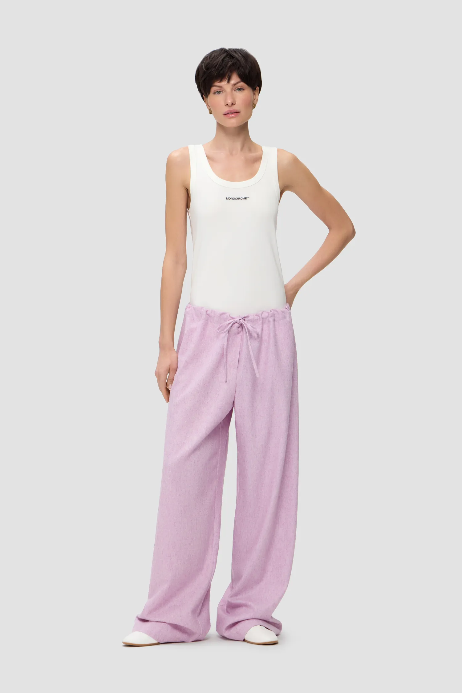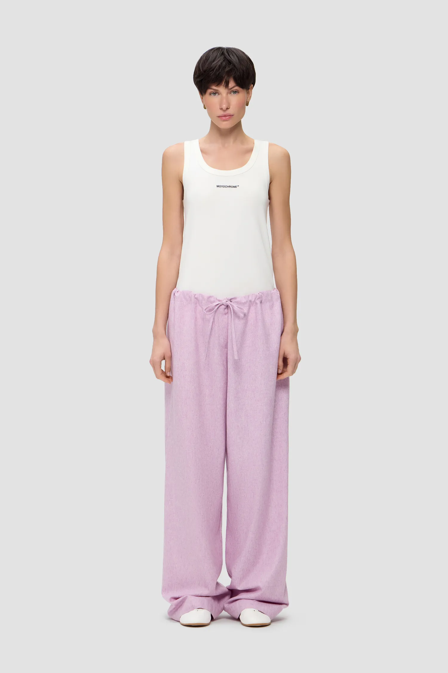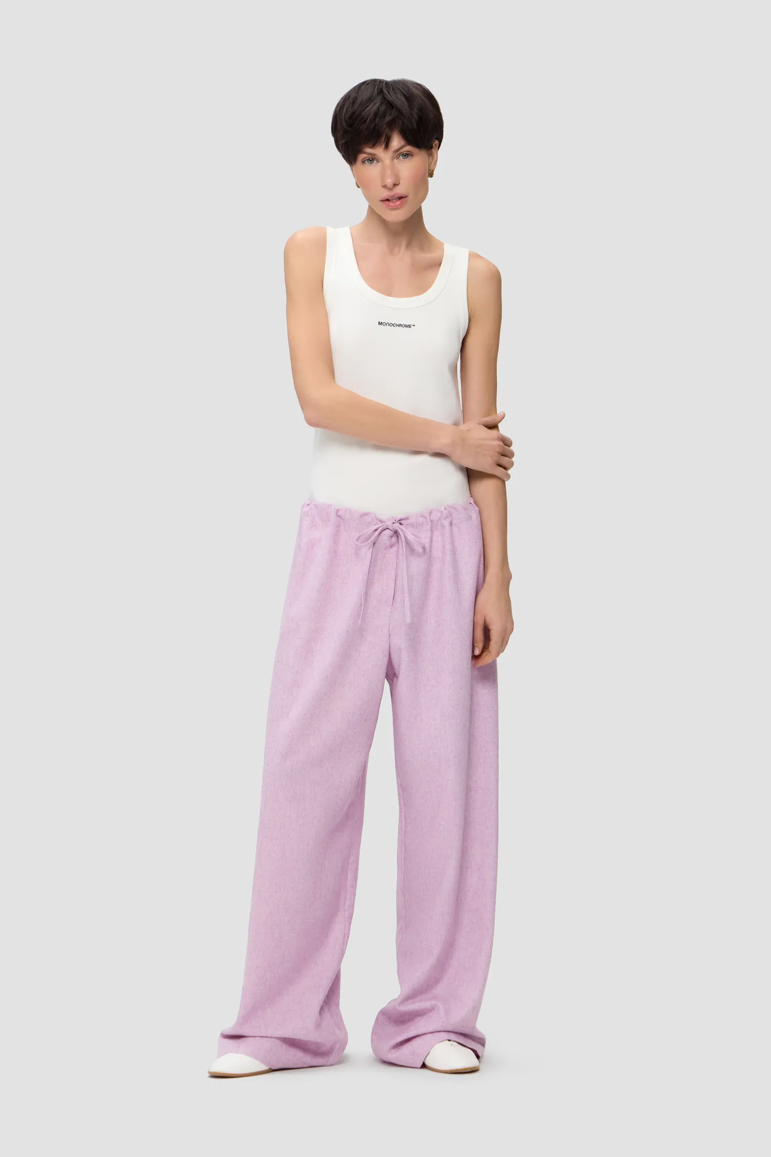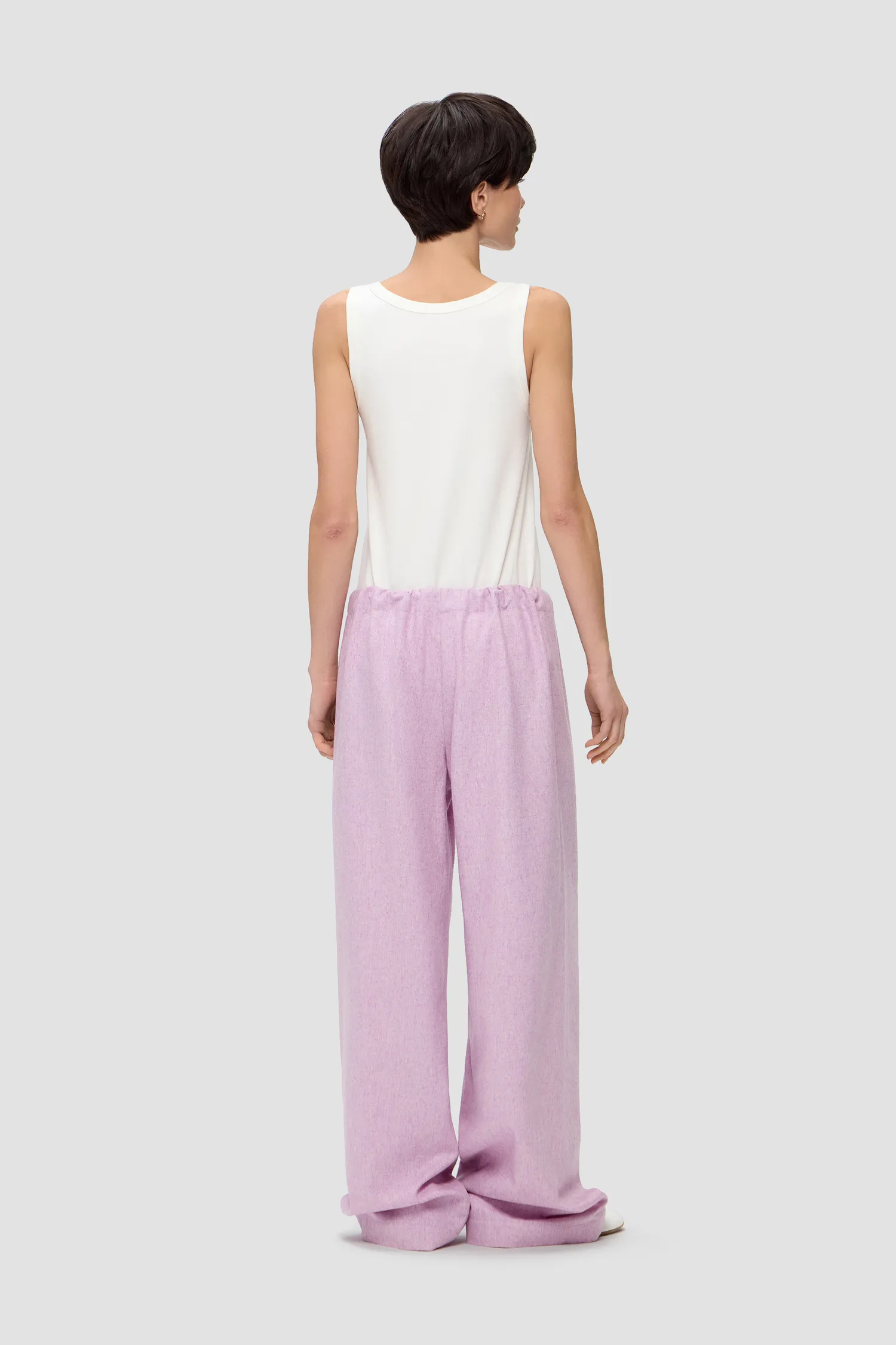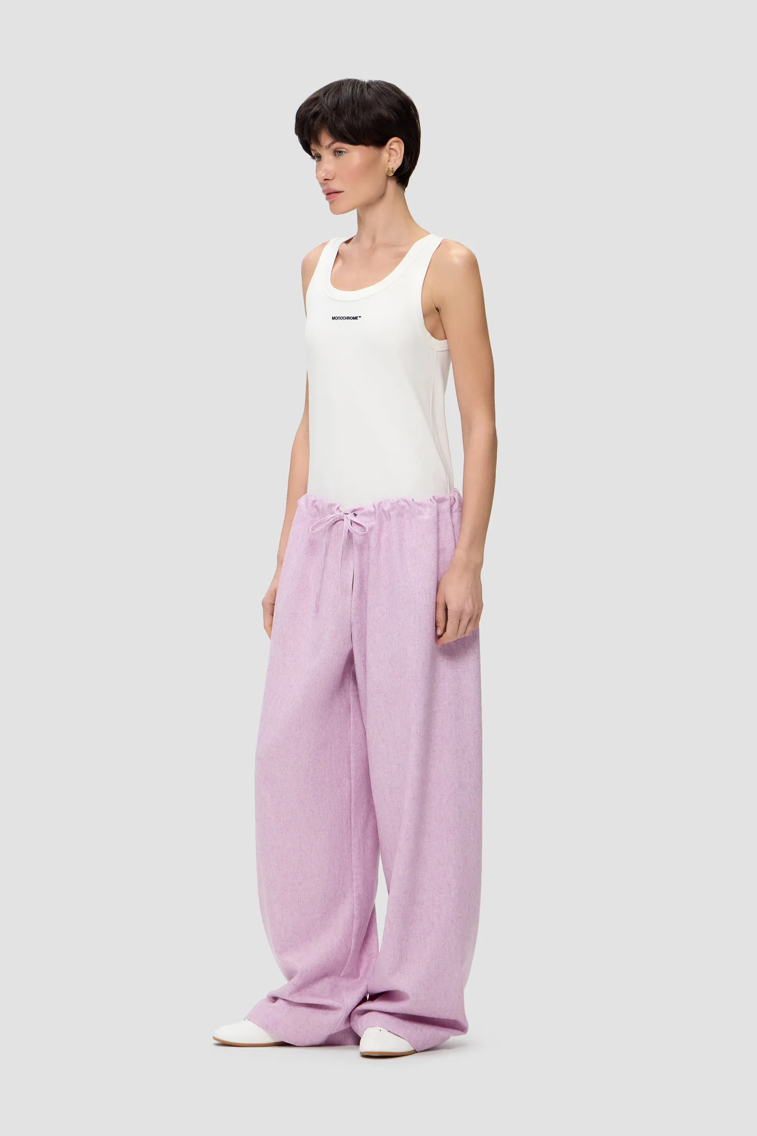 Прямые брюки из смесовой шерсти лилового оттенка. Пояс на резинке с завязками. Упаковка в подарочную коробку. Сделано в России на собственной мануфактуре MONOCHROME.