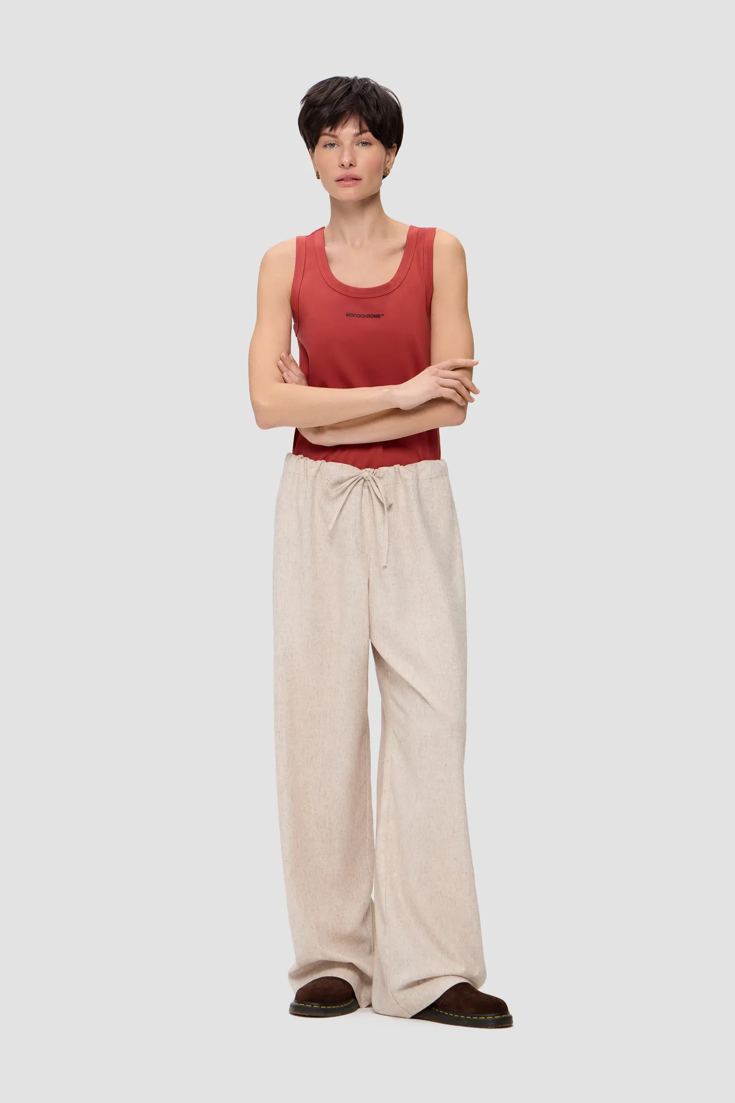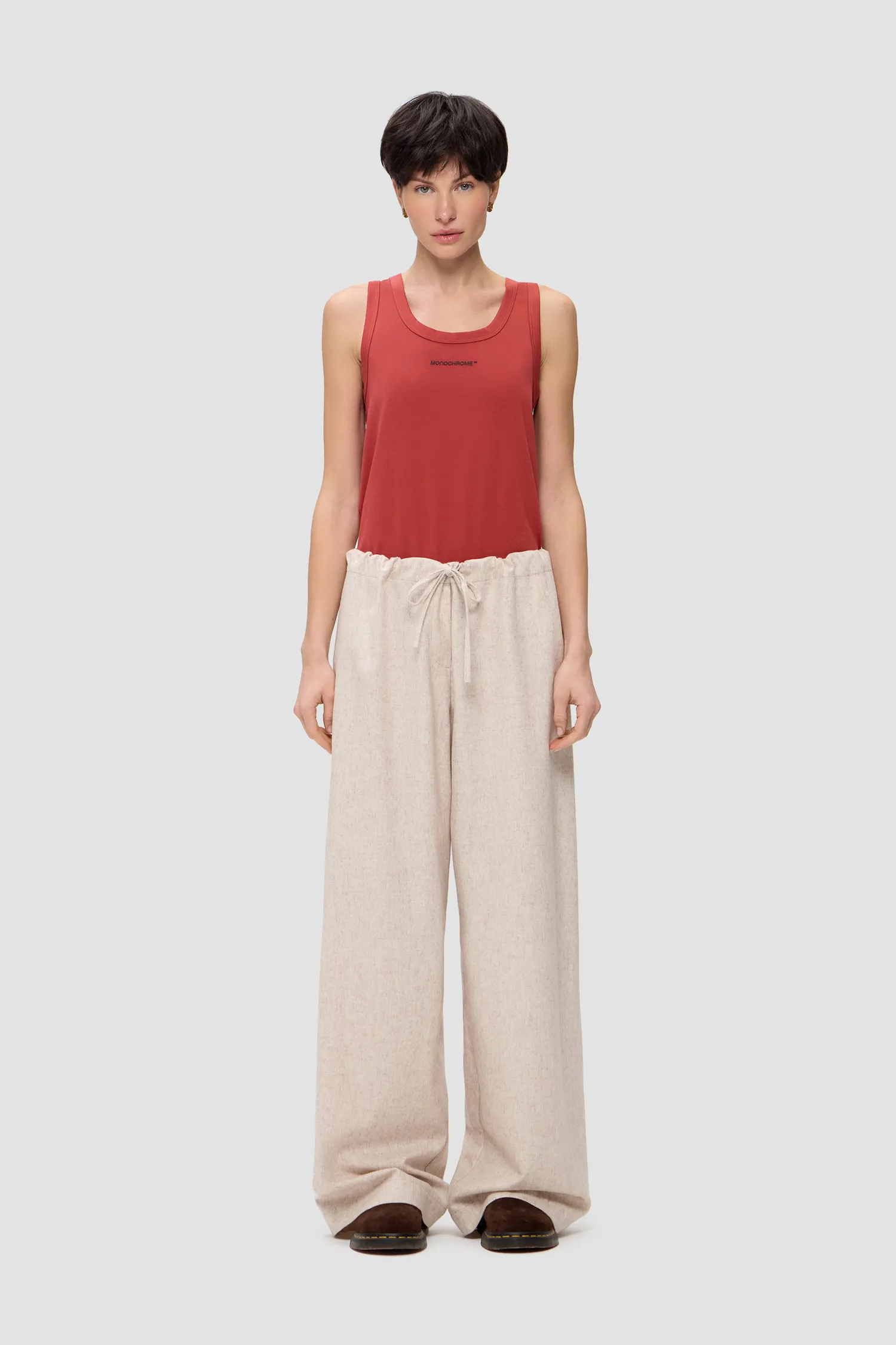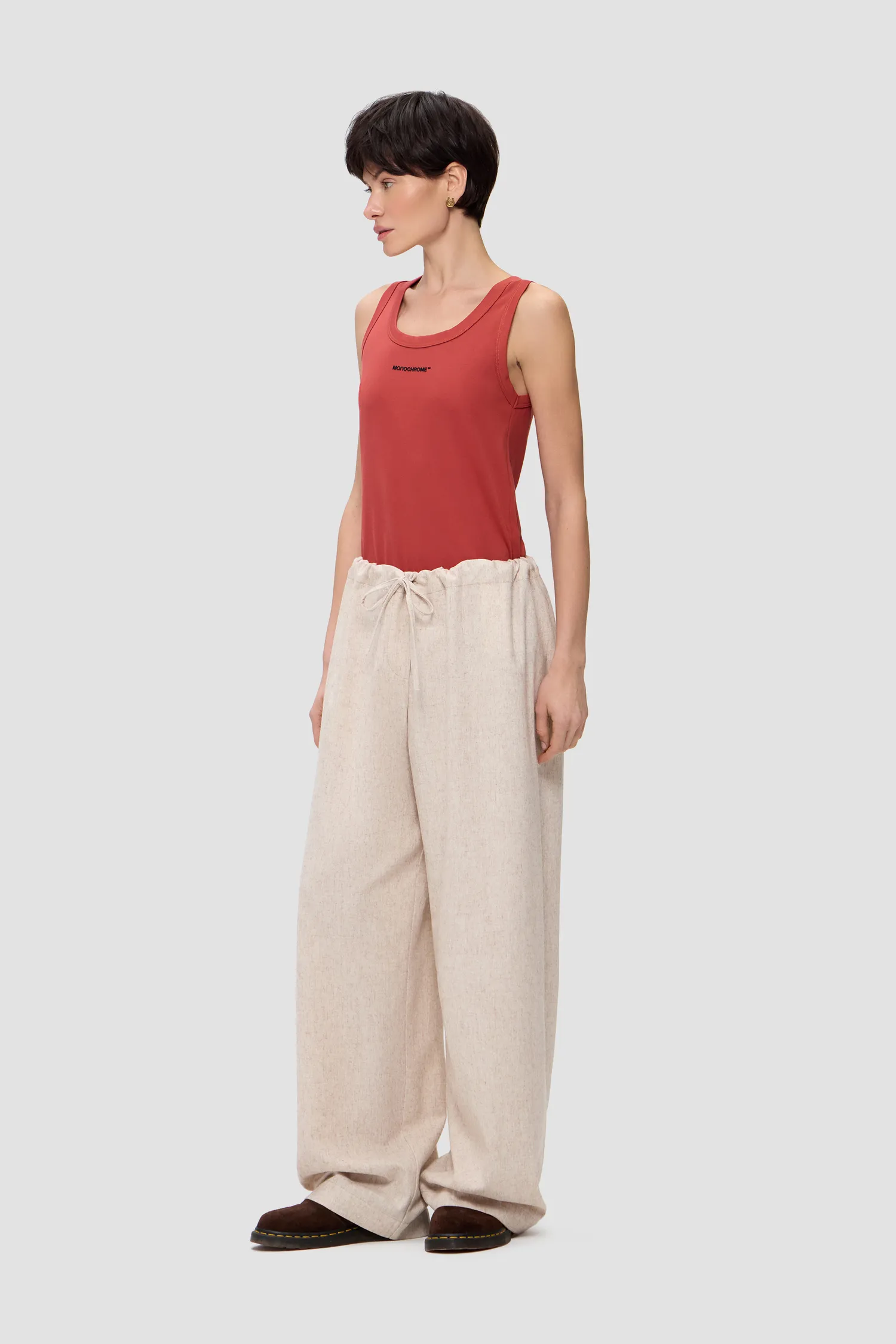 Прямые брюки из смесовой шерсти песочного оттенка. Пояс на резинке с завязками. Упаковка в подарочную коробку. Сделано в России на собственной мануфактуре MONOCHROME.