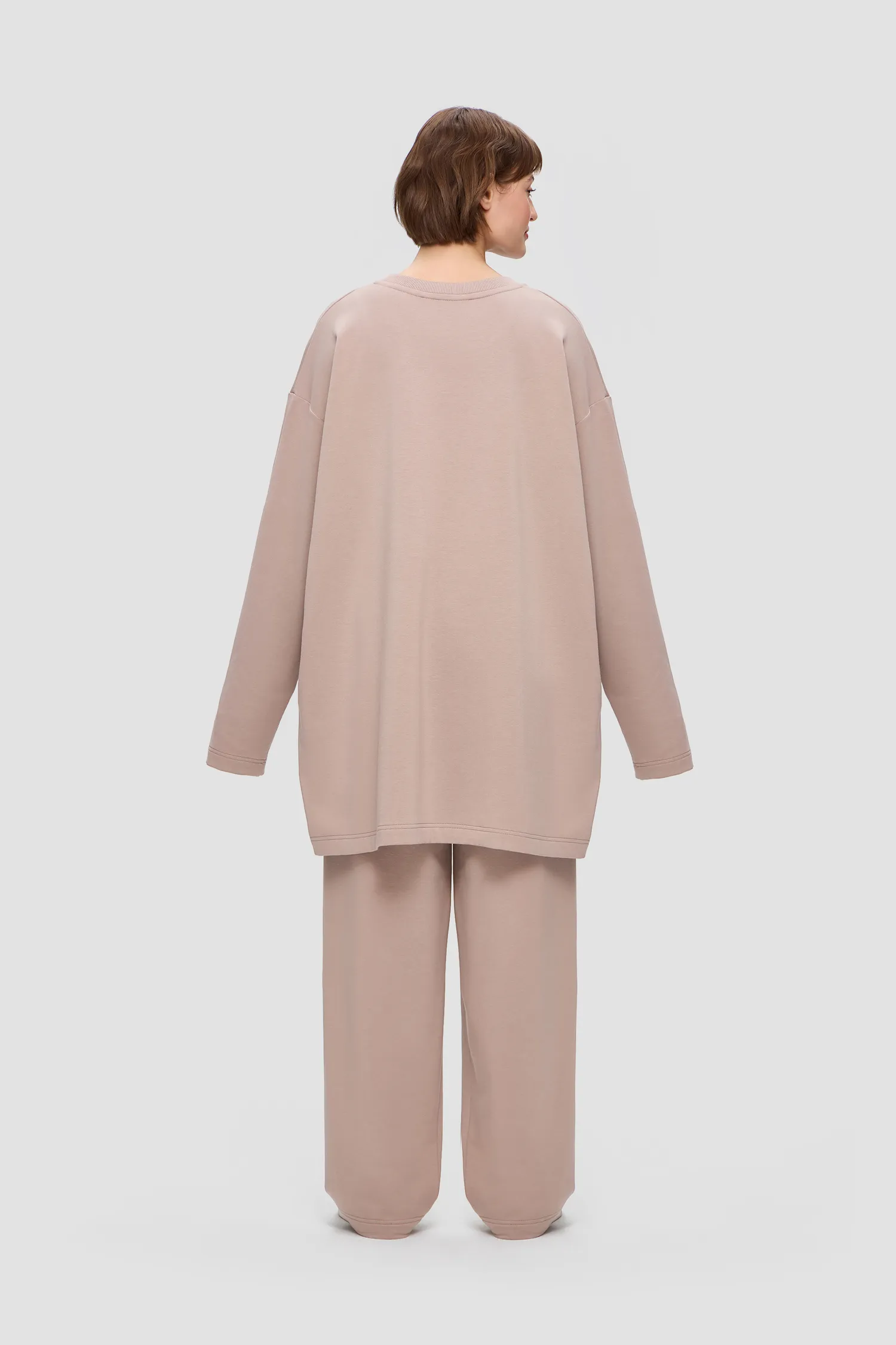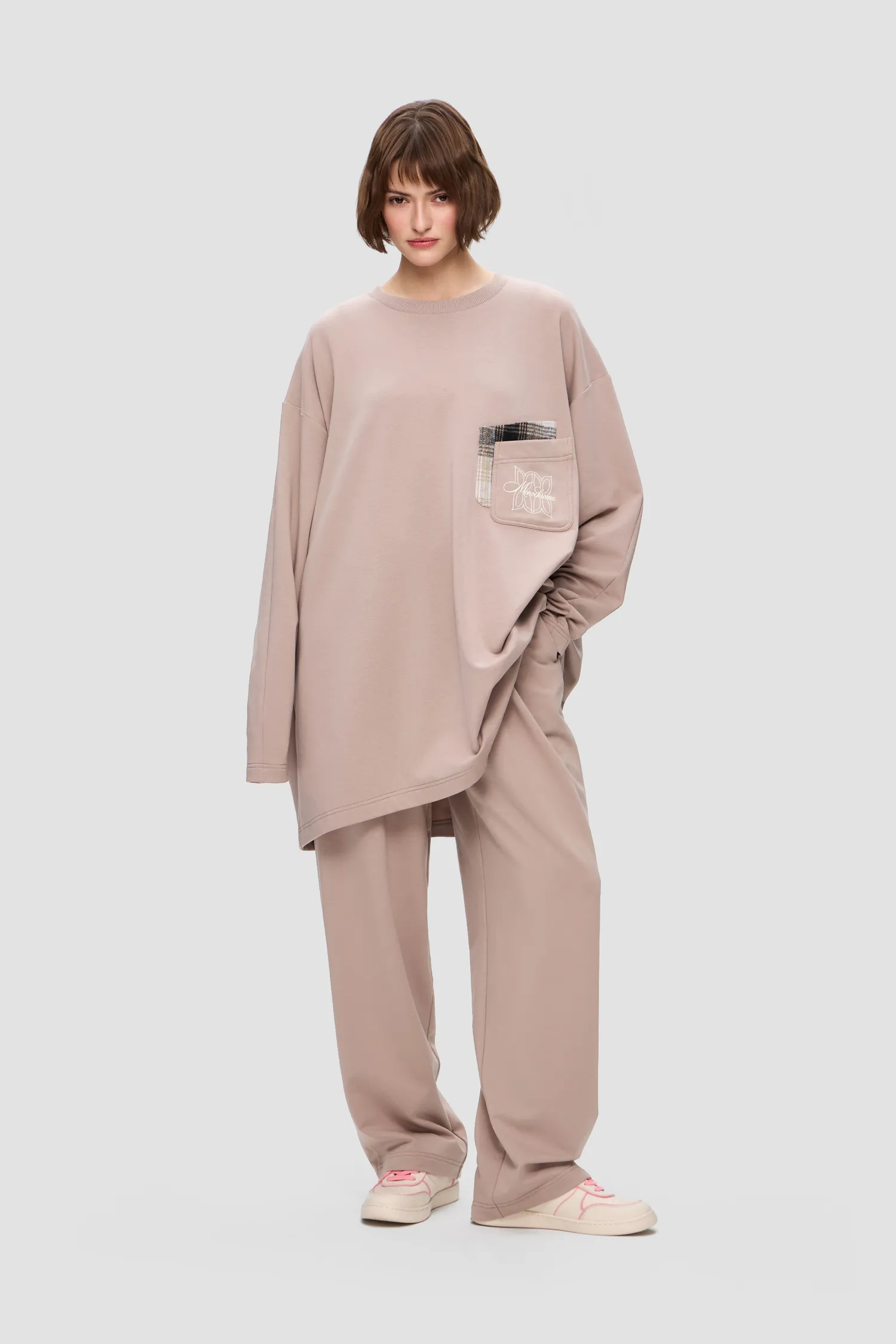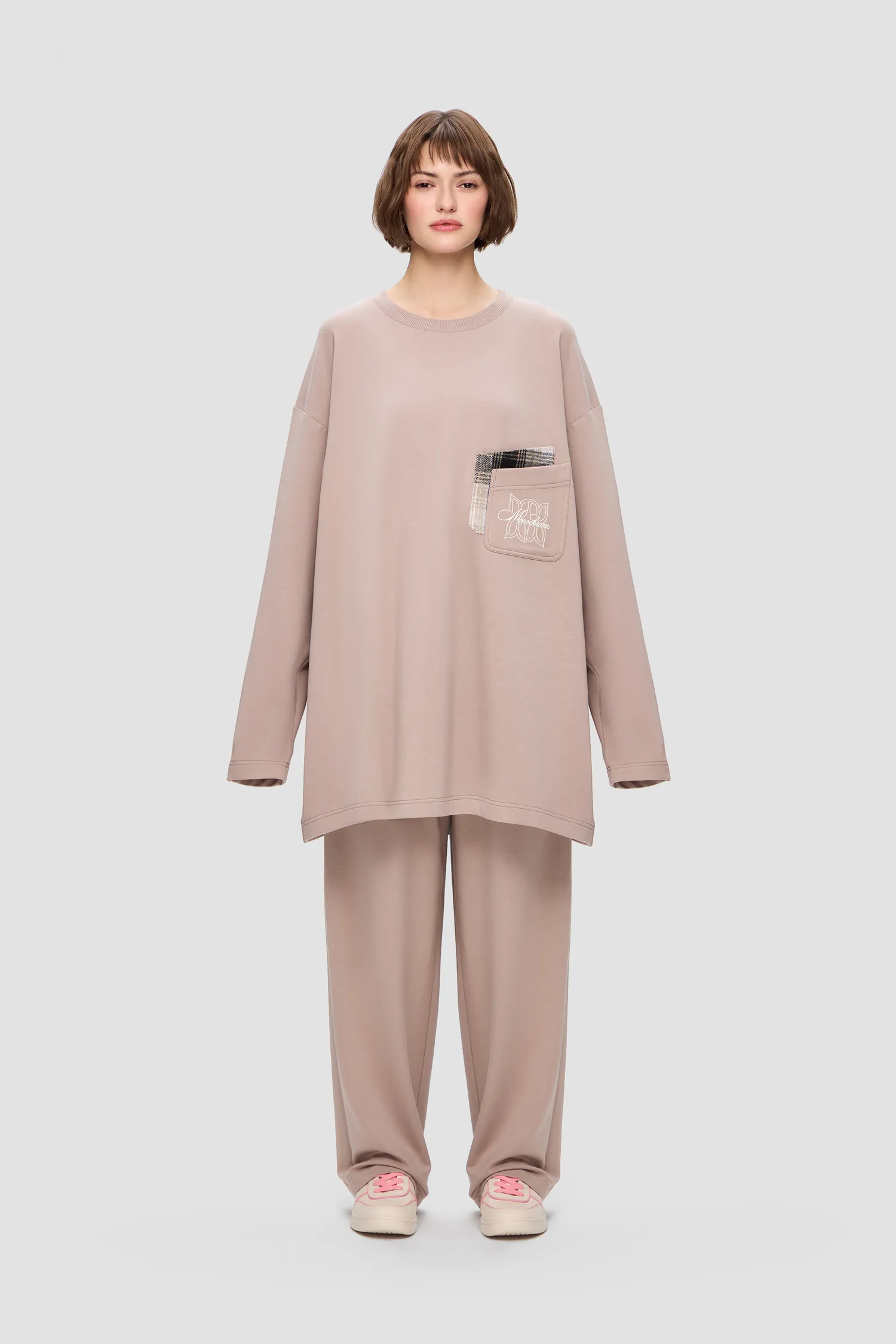 Домашний костюм из хлопкового футера. Удлиненный лонгслив с о-образным воротником. Двойной нагрудный карман с рельефным логотипом MONOCHROME и звеньями фирменного паттерна. Брюки на резинке из струящейся ткани с завязками. Скрытые карманы в боковых швах брюк. Упаковка в подарочную коробку. Сделано в России на собственной мануфактуре MONOCHROME.