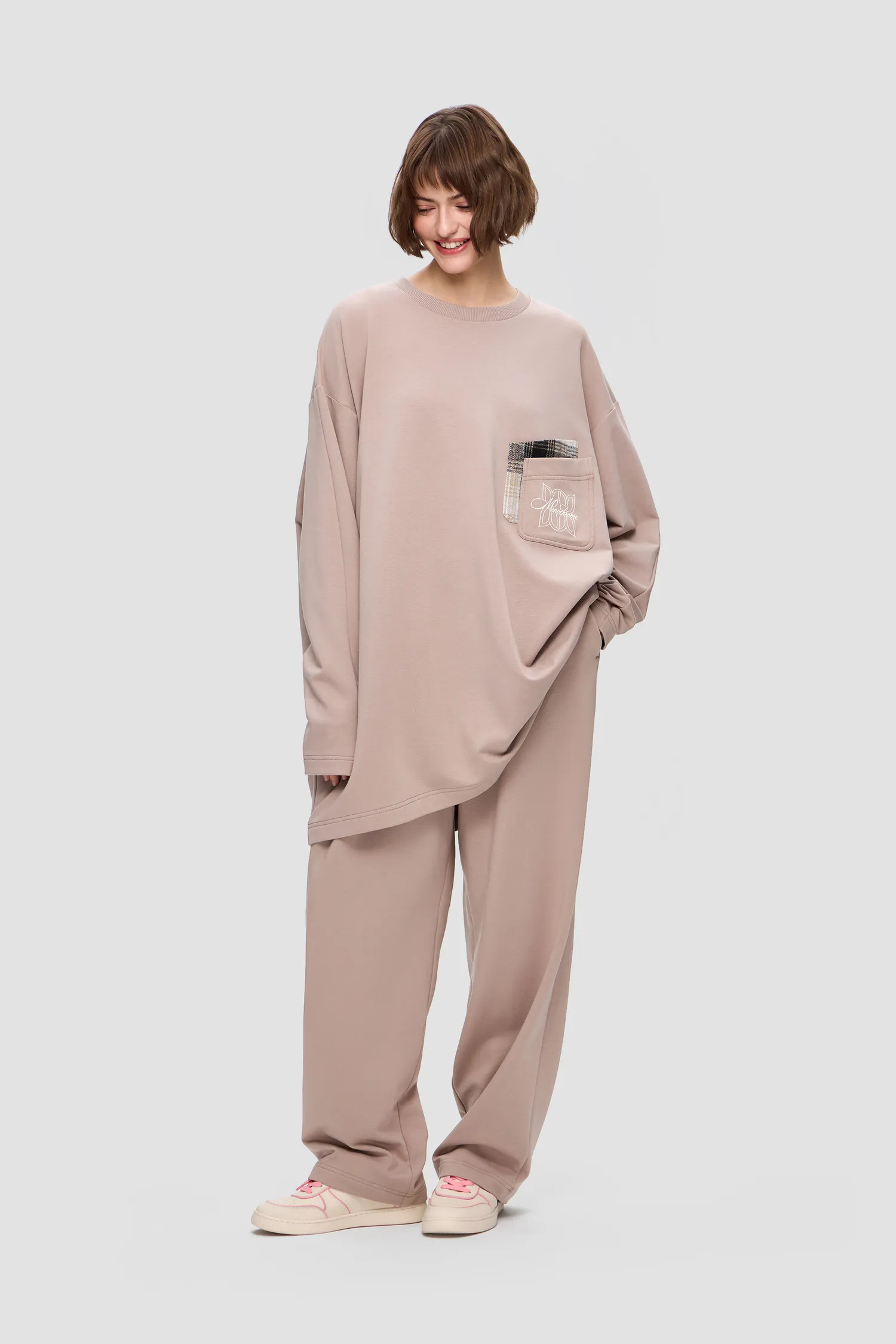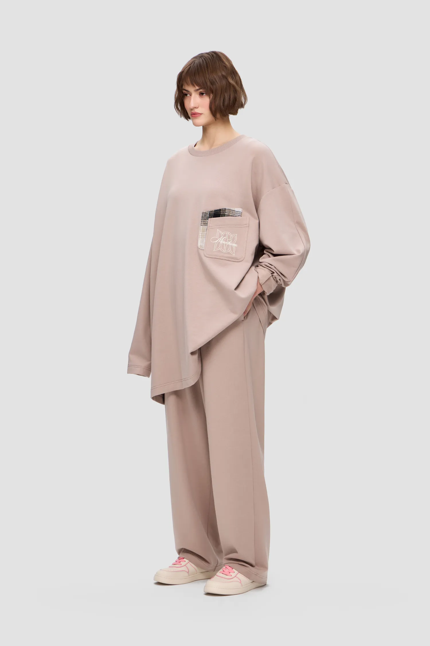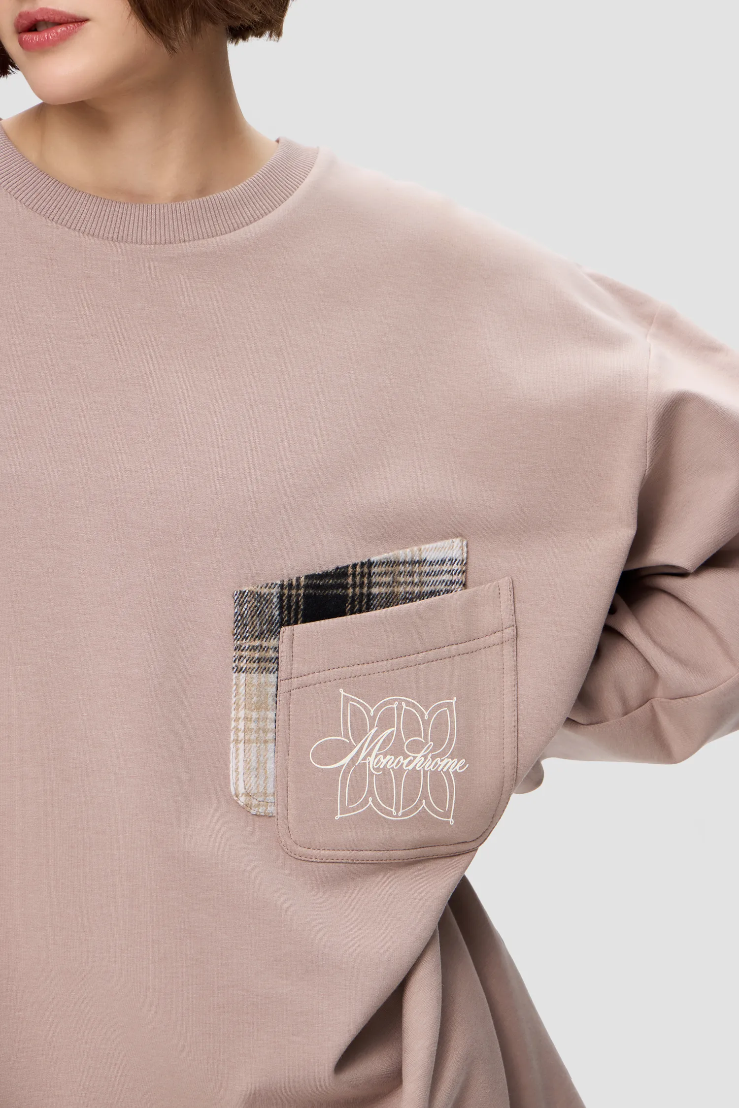 Домашний костюм из хлопкового футера. Удлиненный лонгслив с о-образным воротником. Двойной нагрудный карман с рельефным логотипом MONOCHROME и звеньями фирменного паттерна. Брюки на резинке из струящейся ткани с завязками. Скрытые карманы в боковых швах брюк. Упаковка в подарочную коробку. Сделано в России на собственной мануфактуре MONOCHROME.