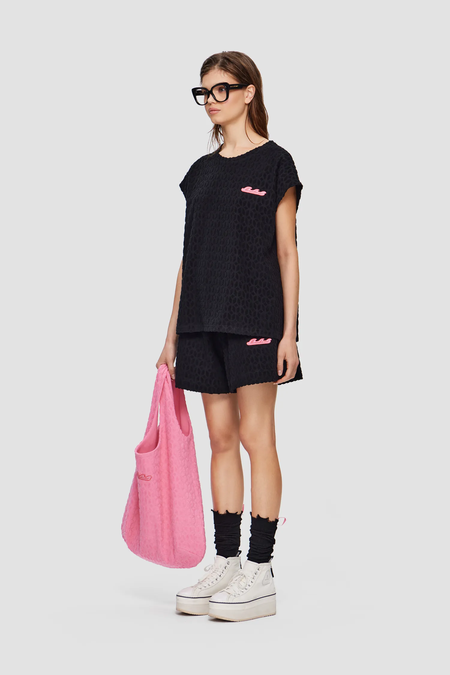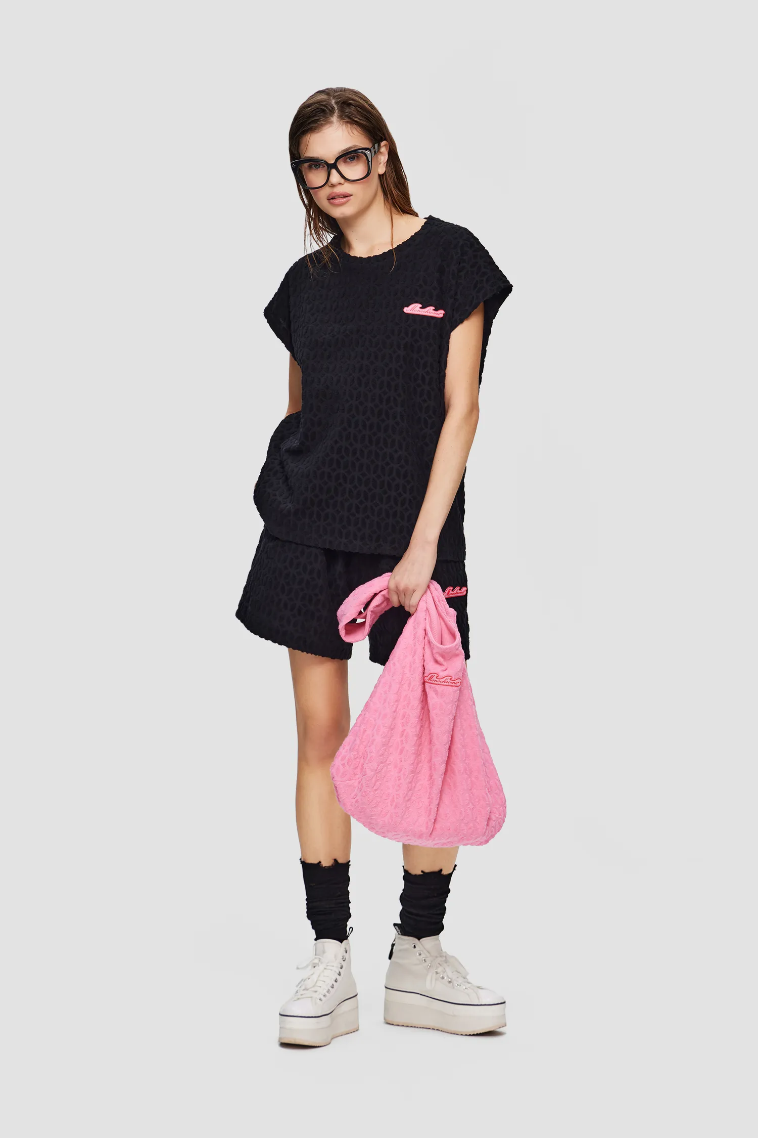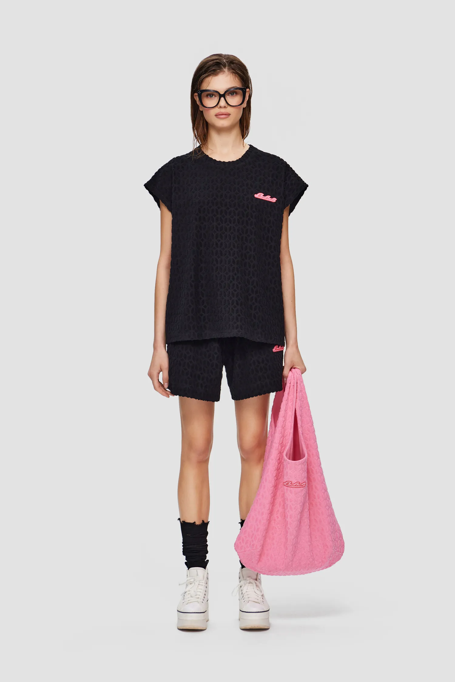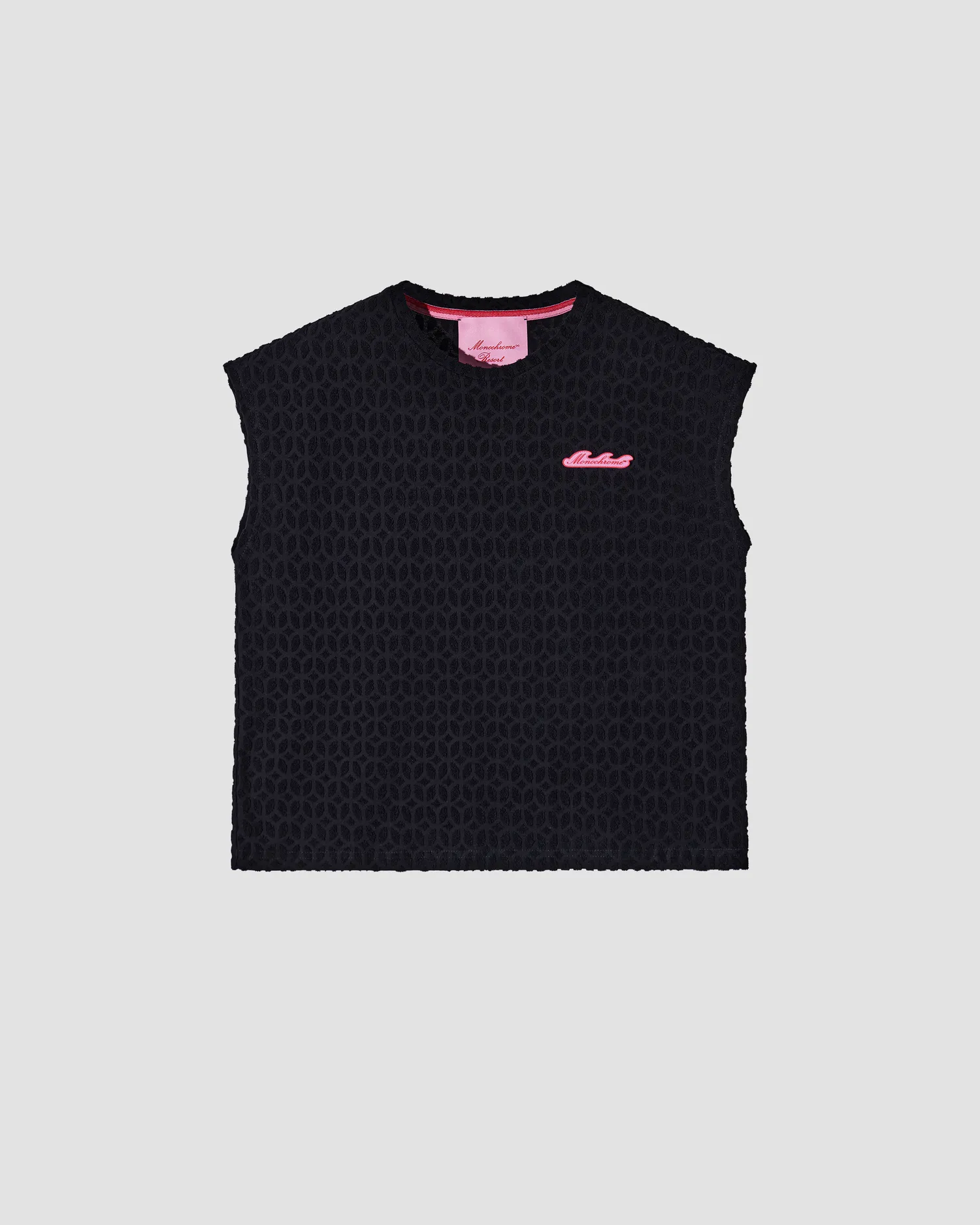 Майка из махровой ткани с фактурным узором в виде фирменного паттерна MONOCHROME. Полотно выполнено из мягкого 100% хлопка, приятного на ощупь. В области груди расположена полимерная нашивка в виде волны, разработанная специально для капсулы RESORT. Упаковка в подарочную коробку. Сделано в России на собственной мануфактуре MONOCHROME.